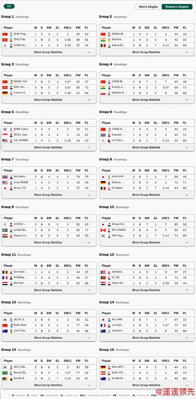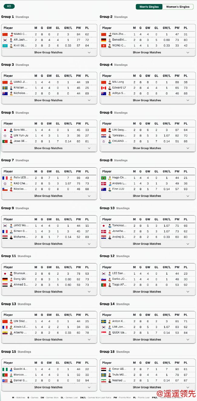 男单第6组比赛中,林高远用时32分33秒,直落四局,最终以4-0(11-4/11-3/11-6/12-10)横扫中国台北老将庄智渊,晋级16强。前三局,林高远分别打出一波4-0、8-0和3-0拉开分差并奠定胜局,第四局,双方比分一路紧咬,林高远在8-10落后的情况下,连下4分,以12-10逆转再胜一局。