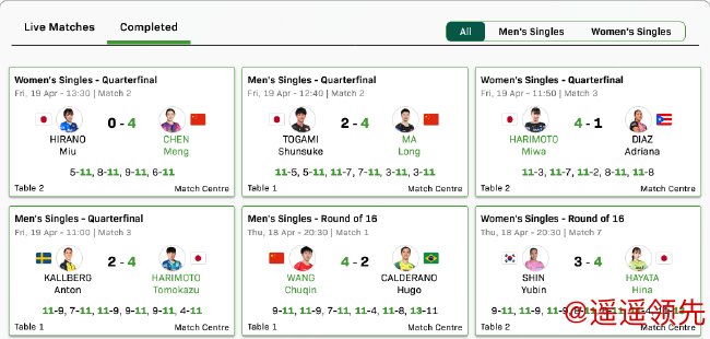 在此前进行的2场1/4决赛中,张本兄妹双双获胜:张本智和用时54分钟34秒,以4-2(9-11/11-7/9-11/11-9/11-9/11-4)战胜瑞典选手卡尔伯格,晋级男单4强;张本美和用时39分钟07秒,以4-1(11-3/11-7/11-2/8-11/11-8)战胜波多黎各选手A-迪亚兹,闯入女单4强。